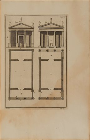 VITRUVIO POLLIONE, Marco - L'Architettura di M. Vitruvio Pollione colla traduzione italiana e comento del marchese Berardo Galiani. Napoli: Di Simone, 1758. Edizione corredata da 25 tavole incise in rame. Folio (392 x 255mm). Antiporta di Francesco La Marra da Bernardo Galiani, vignetta al frontespizio, 25 tavole, fregi e capilettera, il tutto inciso in rame, alcune grandi vignette xilografiche (aloni di umidità, più marcati al margine inferiore, occasionali bruniture). Legatura in vitello coevo, tassello con titolo al dorso (macchie di umidità e fioriture). Provenienza: timbro a forma di mappamondo.