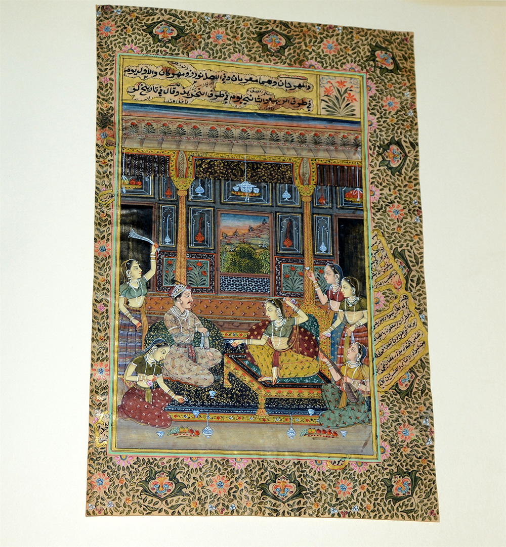 Raccolta di numerose stampe e miniature persiane con influenze stilistiche indiane (39x39 cm), entro due album in piena pelle.