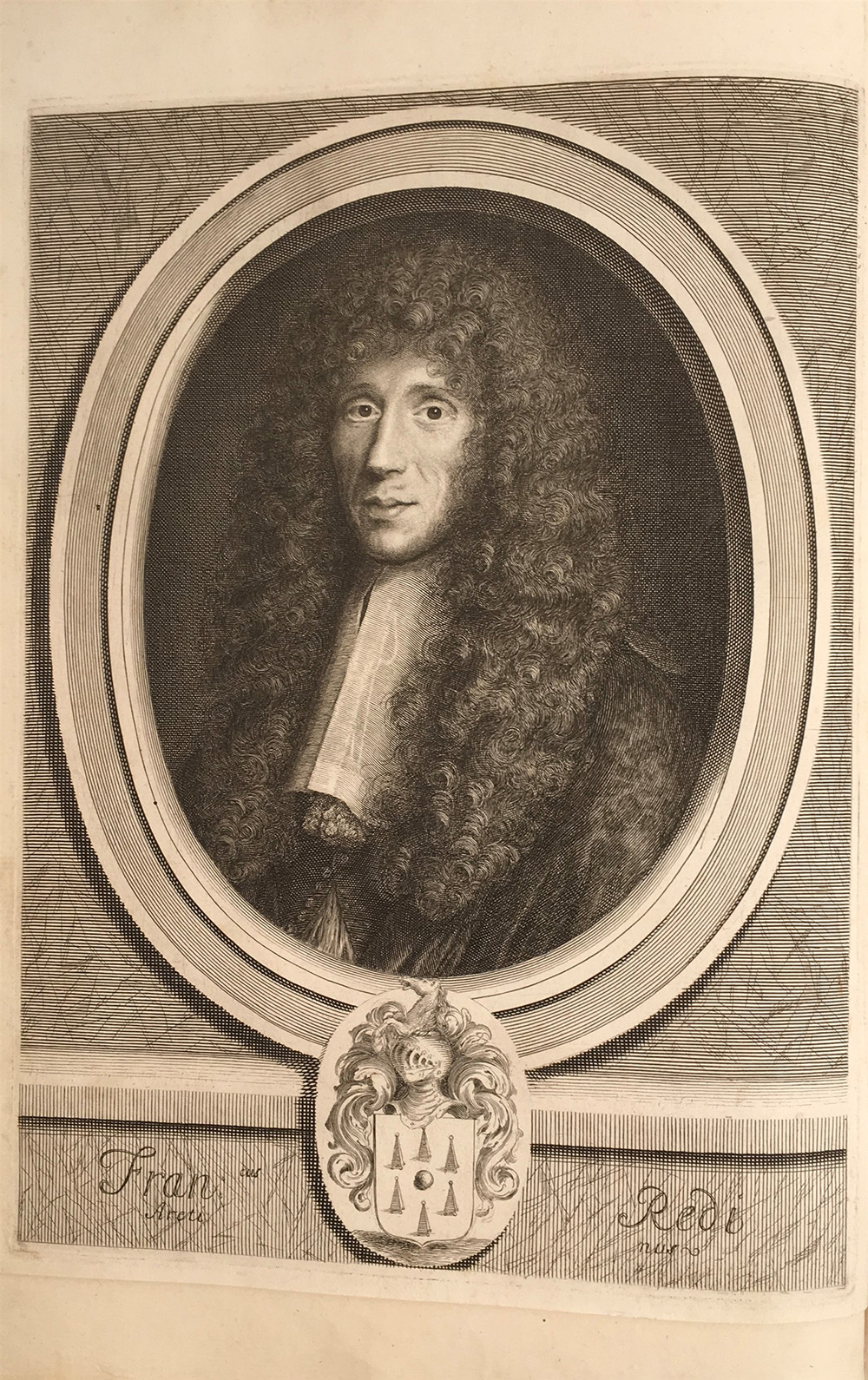 REDI, Francesco (1626-1697) - Sonetti. Firenze: Stamperia reale e Piero Antonio Brigonci, 1702. Prima edizione postuma dagli ampi margini. Folio (418 x 270mm). Occhiello, marca tipografica della Crusca al frontespizio, ritratto dell'autore contenuto in ovale inciso da Domenico Tempesti, numerose vignette incise nel testo (manca l'antiporta calcografica eseguita da Antonio Lorenzini e Antonio Domenico Gabbiani, ritratto dell'autore con margine inferiore più corto).