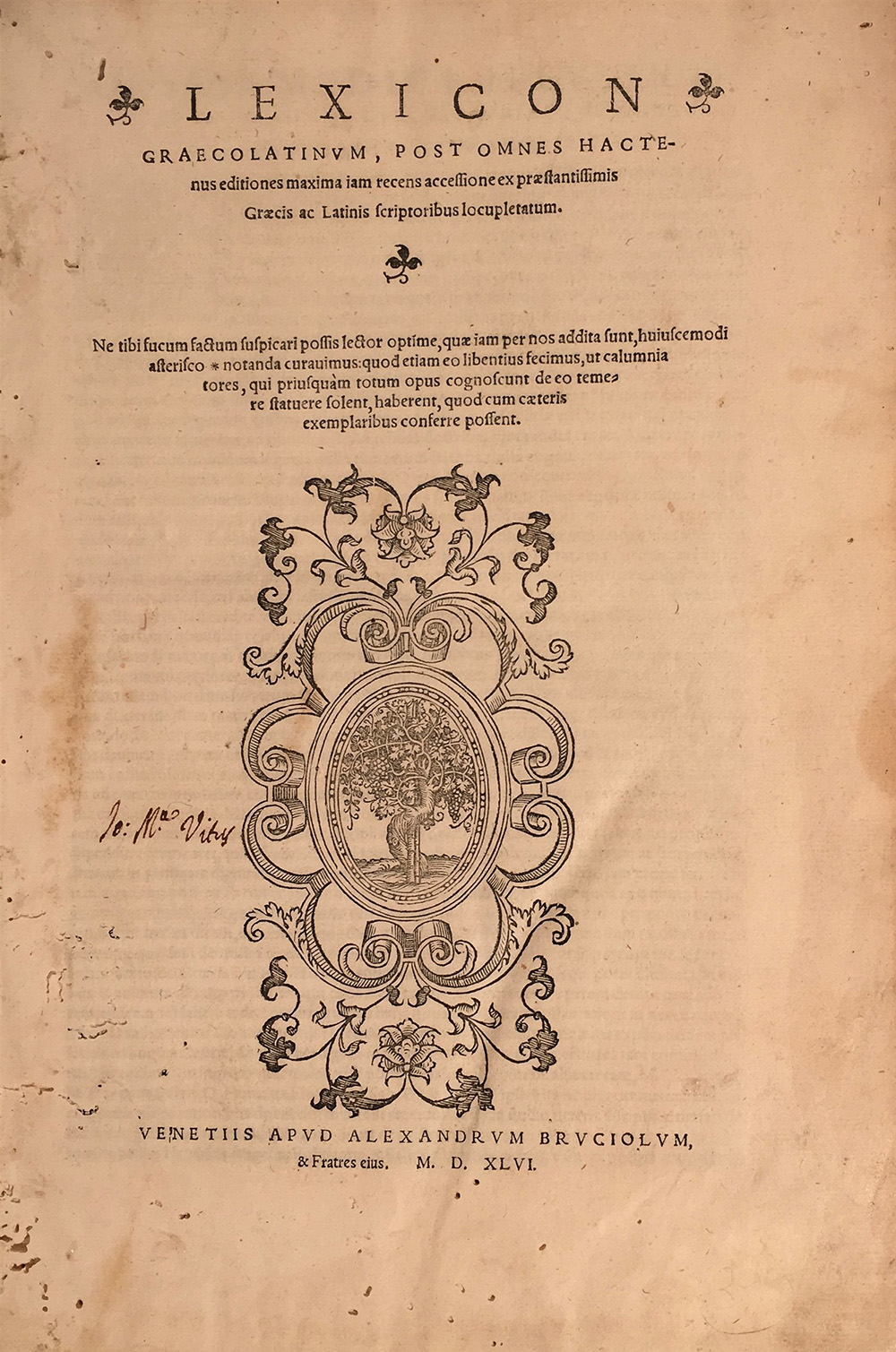 Lexicon Graecolatinum. Venezia: A. Brucioli, 1546. In folio (diffusi segni di...