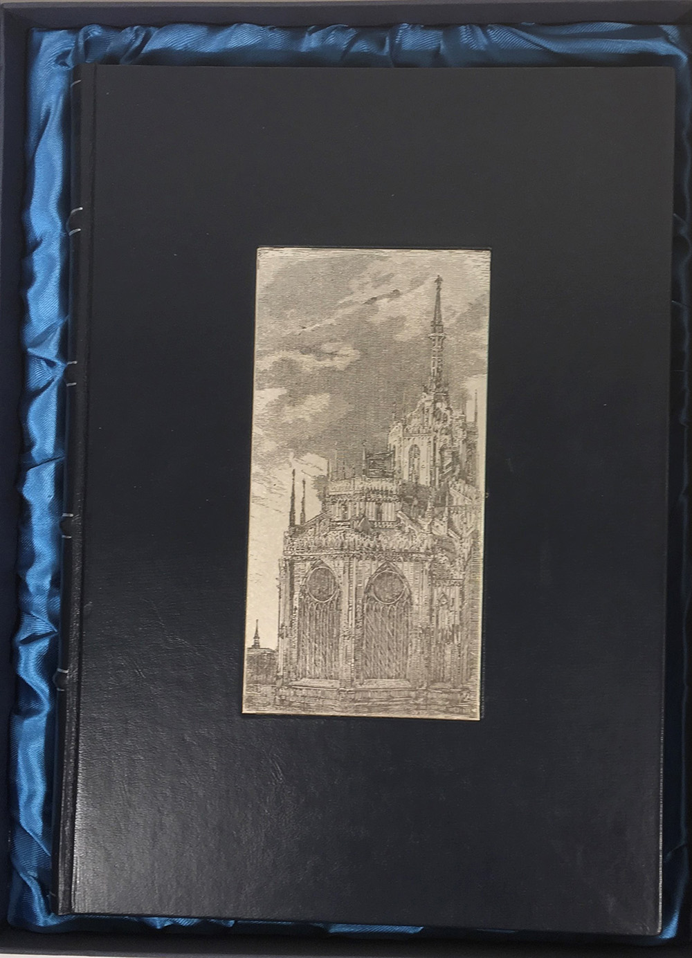 JANO, Marcel - Milano nelle stampe popolari e storia della costruzione del Duomo. Milano: Le connaisseur du livre, 1971. Esemplare 434 di 500, con riproduzioni di vedute di Milano e oggetti relativi alle arti minori. Legatura in piena pelle blu, placca metallica raffigurante il Duomo sul piatto anteriore, in custodia editoriale (lievi difetti).