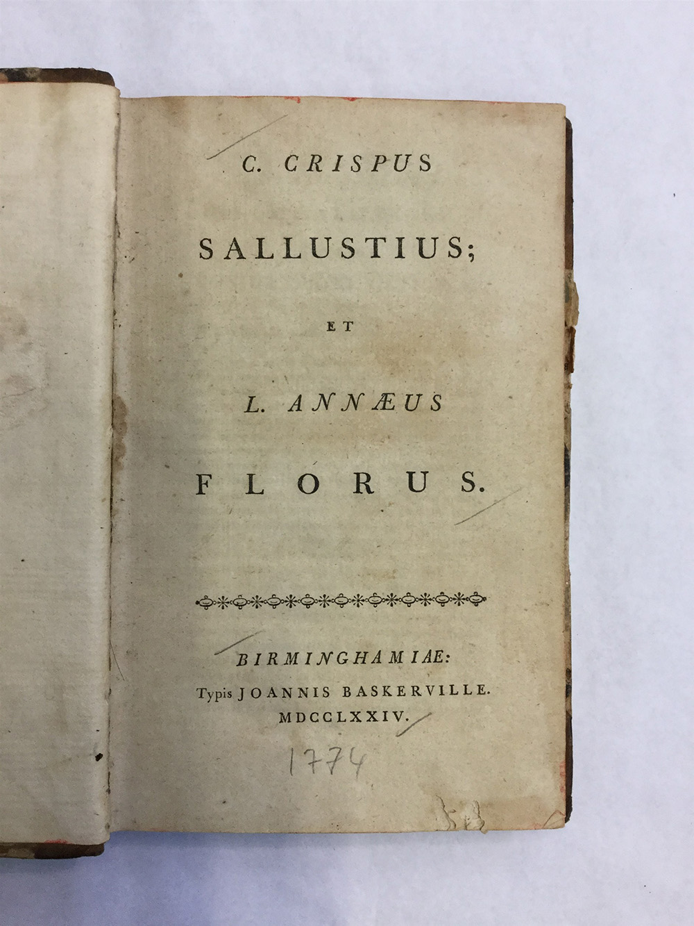 SALLUSTIO, Gaio Crispo - FLORIO, Lucio Anneo. Bellum Catilinarium, Bellum Jugurthinum, Epitome Rerum Romanarum. Birmingham: Giovanni di Baskerville, 1774. Vol. in 8vo (segni di tarli, lievi bruniture). Legatura in mezza pelle (difetti).
