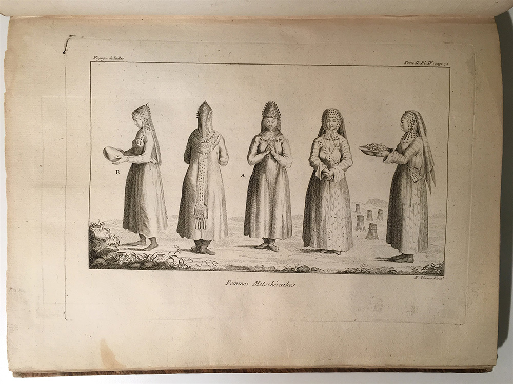 PALLAS, Peter Simon - Voyages dans plusieurs provinces de l'empire de Russie et dans l'Asie septentrionale. Parigi: Lagrange, 1788-93. 5 voll. in 8vo e un atlante in folio, con numerose incisioni di cui 6 carte in formato oblungo raffiguranti rispettivamente l'impero di Russia (lievi difetti), Volga e Urali, carta mineralogica dei monti Urali, monti Altai, una parte del Tobol'sk e di Irkutsk, colonie tedesche (difetti e restauri). Legature in mezza pelle, rispettivamente uniformi quelle dei voll. 1 e 6, e 2-4 (danni meccanici, specie ai dorsi, vol. 4 dorso staccato, fori di tarlo).