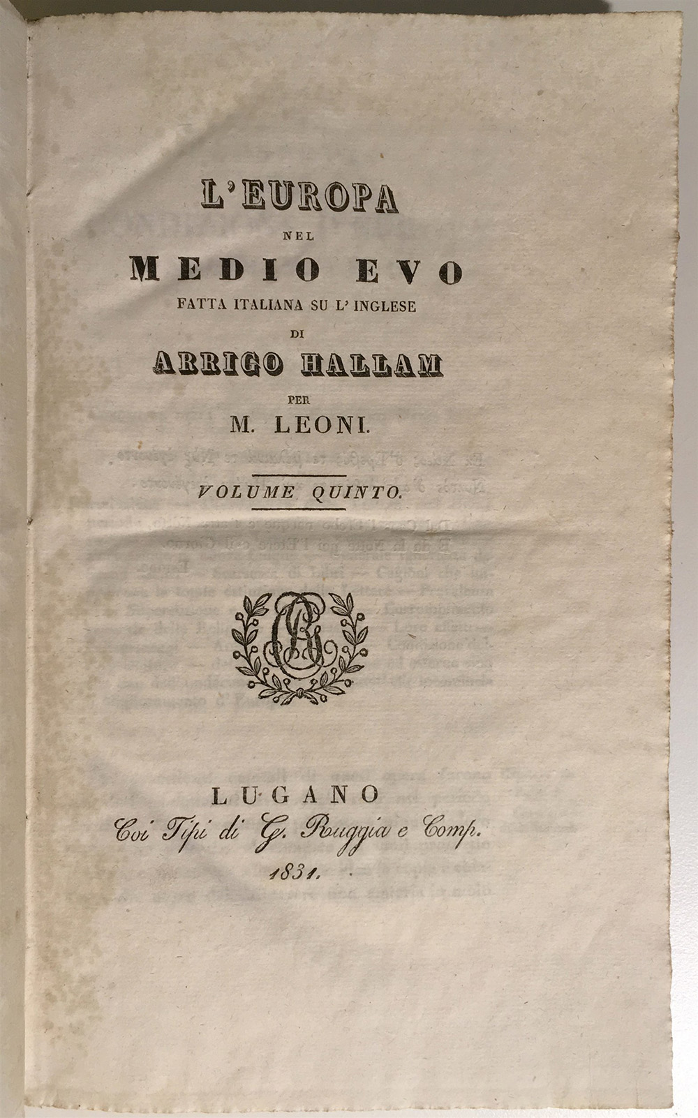 HALLAM, Henry - L'Europa nel Medioevo fatta italiana su l'inglese per M. Leoni. Lugano: Tipi di G. Ruggia e Comp., 1829-31. 5 voll. in 8vo (gore di umidità diffuse, muffe). Legatura in mezza pelle (tarli, danni derivanti dall'usura).