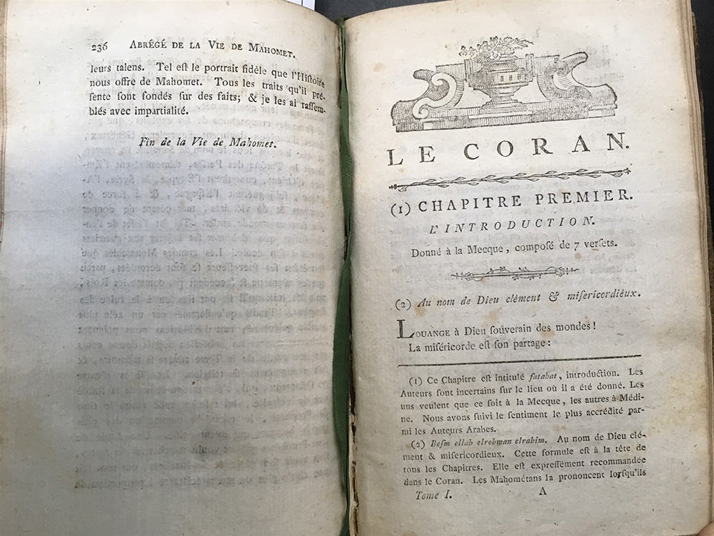 SAVARY, Claude - Le Coran traduttore de l'Arabe. Amsterdam, Leida, Rotterdam, Utrecht: chez les libraires associés, 1786. Due voll. in 8vo piccolo, corredato della vita del profeta Maometto (fioriture e bruniture). Legatura coeva in mezza pelle; nota di possesso sul piatto anteriore (lievi difetti).