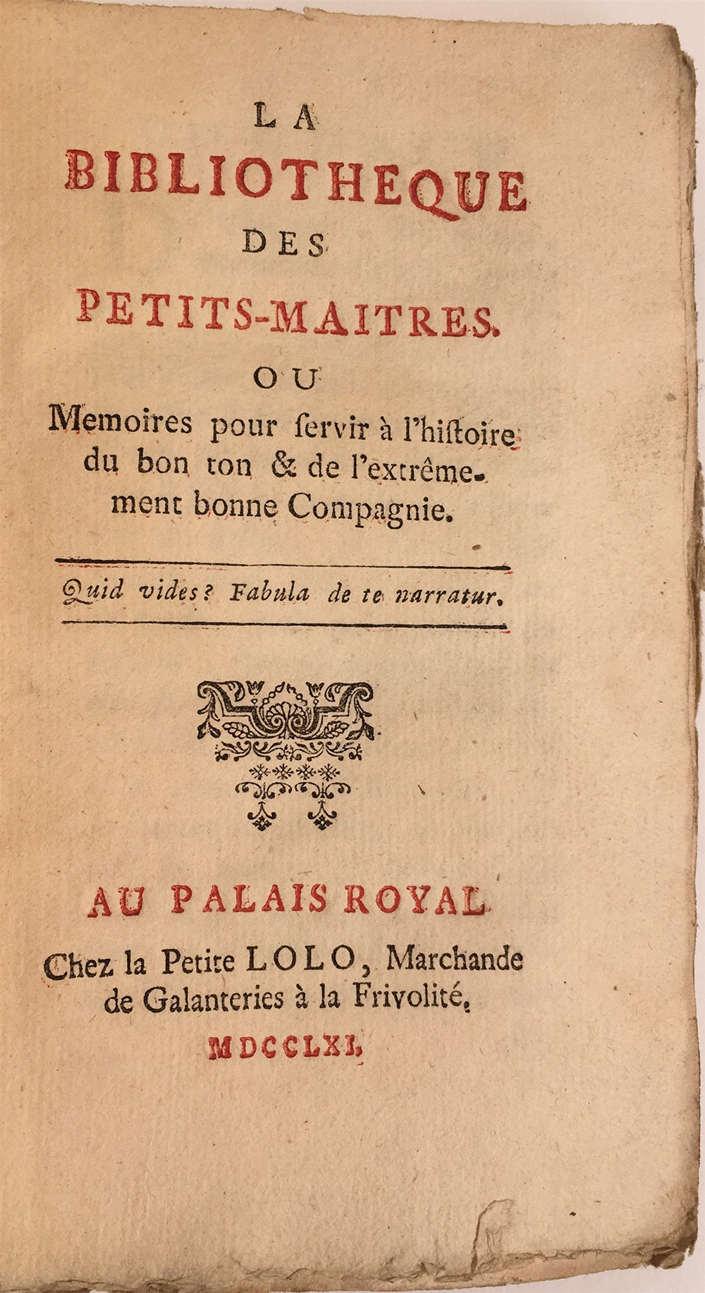 GAUDET, François-Charles - La bibliotheque des petits-maitres. Au Palais Royal, Chez la Petite Lolo, 1761. Prima edizione di quest'opera. Vol. in 12mo, con frontespizio stampato in rosso e nero (lievi difetti). Brossura cartonata (difetti).