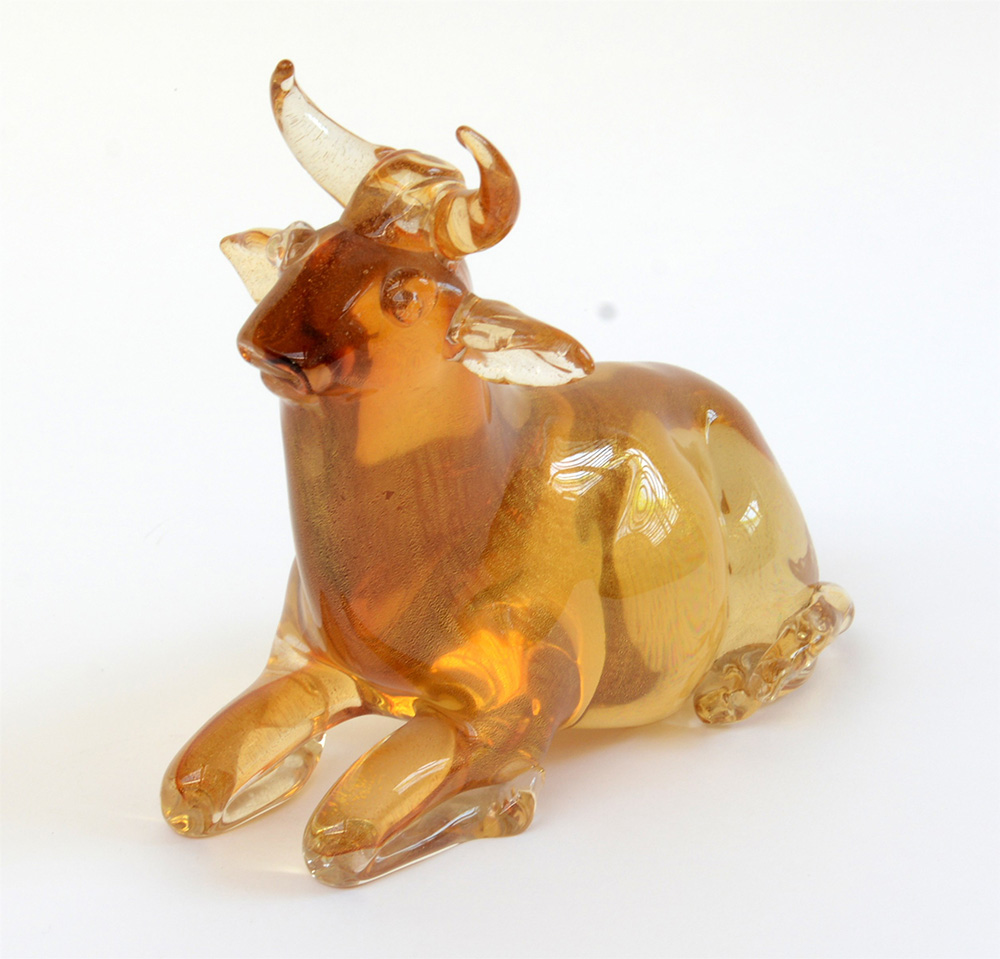 "Toro"Manifattura di Murano.Scultura in vetro sommerso incolore, arancione e...