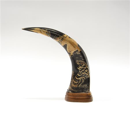 Corno di bufalo con decorazione incisa di tigri e drago. Manifattura del sud-est asiatico, base in legno (lievi difetti)