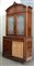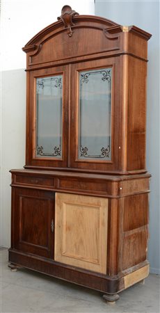 Credenza a due corpi in noce, parte superiore a due ante a vetri, parte inferiore a due cassetti nella fascia e due sportelli. Piedi a cipolla (cm 125x250x55)(difetti e mancanze)