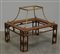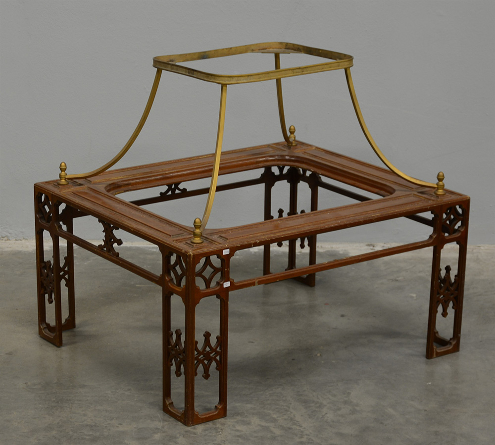 Tavolino da salotto in legno con gambe angolari a giorno sormontato da un’alzata in metallo, mancante dei vetri (cm 82x73x69) (difetti e mancanze)