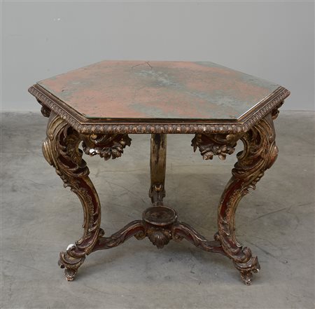 Tavolino da salotto in legno intagliato e dorato a mecca a volute, motivi floreali e vegetali. Gambe mosse riunite da crociera, piano esagonale con vetro a specchio (cm 96x72x85) (difetti)
