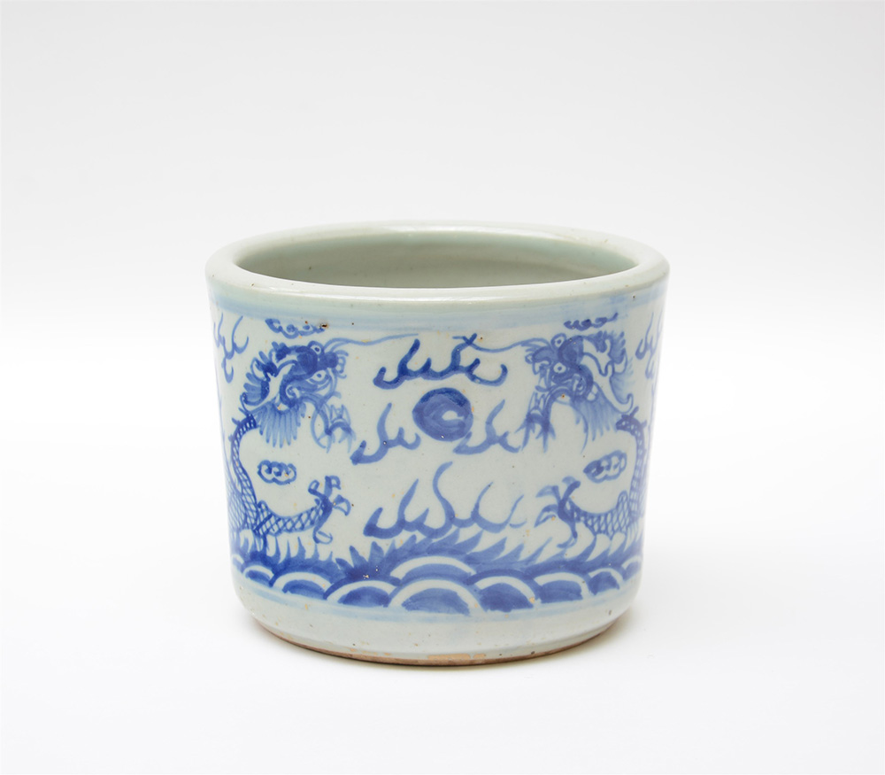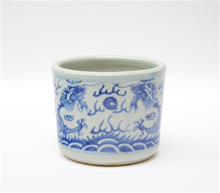 Portafiori cilindrico in porcellana bianca e blu decorato con draghi (lievi...