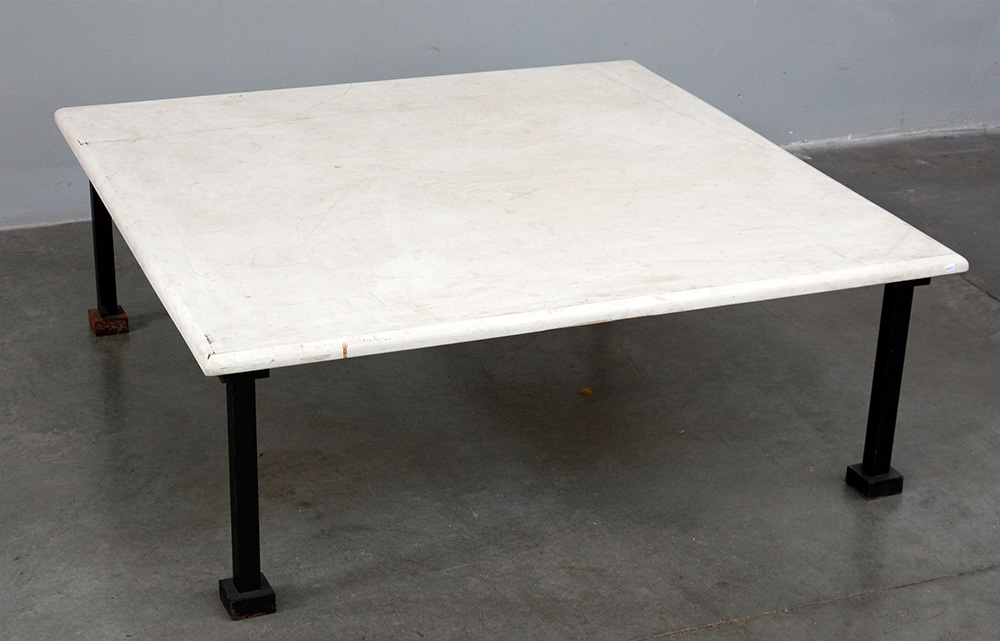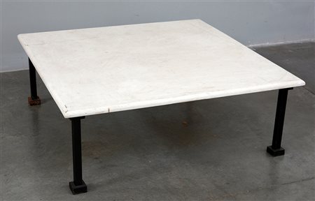 Tavolino da salotto quadrato con piano in scagliola e gambe in ferro verniciato nero (cm 110x40x110) (difetti)