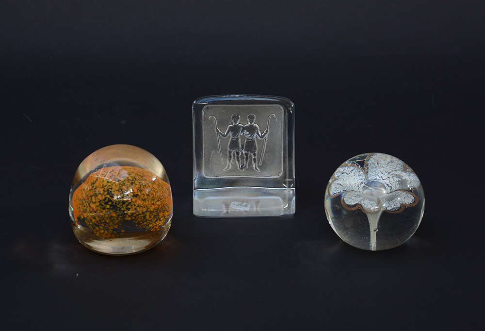 Lotto composto da tre fermacarte in vetro con decori e misure diverse. (lievi difetti)