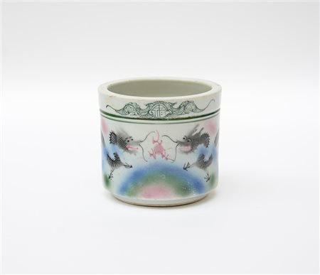Portafiori cilindrico in porcellana policroma decorato con draghi (lievi difetti)
