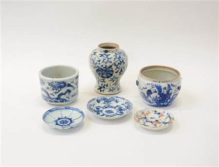 Lotto composto da tre vasi e tre piattini in porcellana bianca e blu e policroma, misure diverse (difetti e restauri)