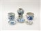 Lotto composto da tre vasi e tre piattini in porcellana bianca e blu e...