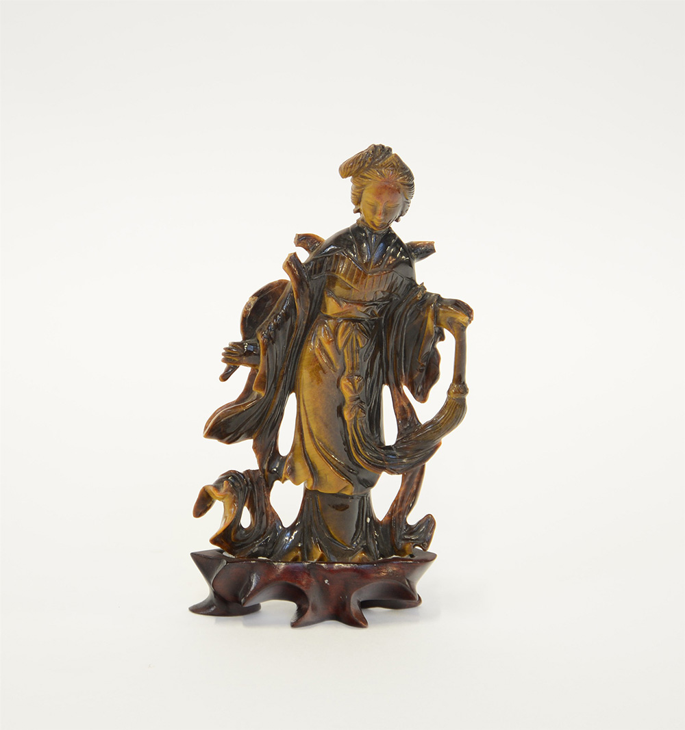 Scultura in occhio di tigre raffigurante dama dalle lunghe vesti con base in legno (difetti e mancanze)