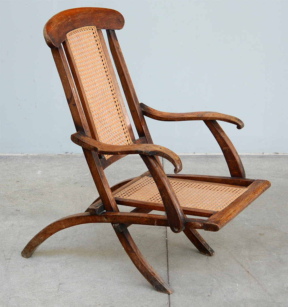 Poltroncina pieghevole in noce con braccioli ricurvi e schienale e seduta cannettè. Inizio secolo XX. (difetti)