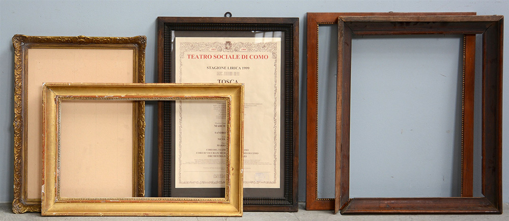 Lotto composto da cinque cornici di misure e materiali diversi (difetti)