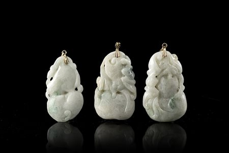 Tre piccole placche in giada scolpite a forma di doppia zucca