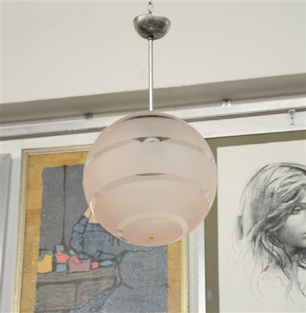 Manifattura di Murano. Lampada a sospensione con diffusore sferico in vetro soffiato rosato trasparente parzialmente satinato sulla superficie esterna e struttura in metallo nichelato. Anni 30 (h cm 55) (lievi difetti)