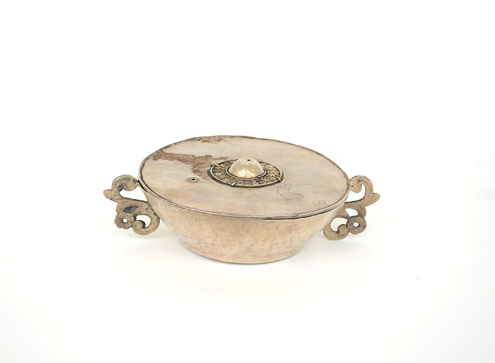 Piccola paiola con coperchio in metallo. Manifattura latinoamericana (largh. cm 19) (difetti)