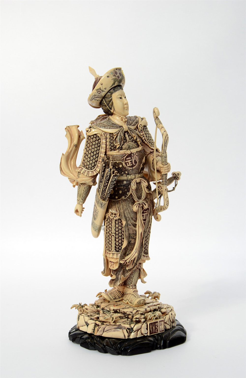 Cacciatrice con arco e spada in avorio con base in legno (h. 45 cm.)(lievi difetti) Cina, sec. XX