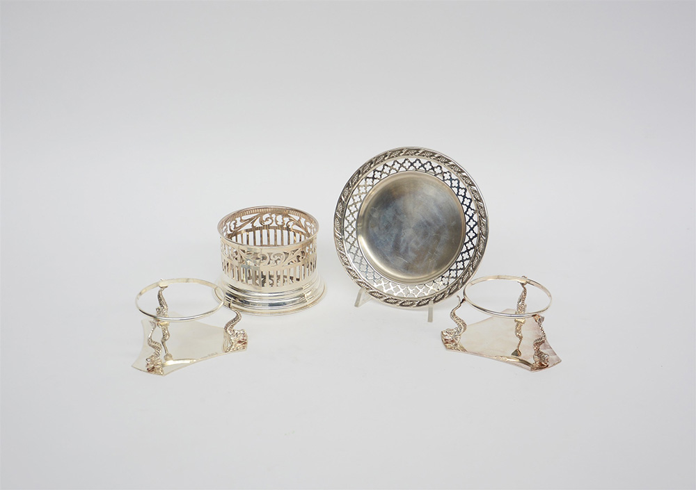 Lotto in argento 925/1000 composto da due basi porta caviale tripodi, un sottobottiglia e un piattino con tesa traforata (gr 680 ca.)