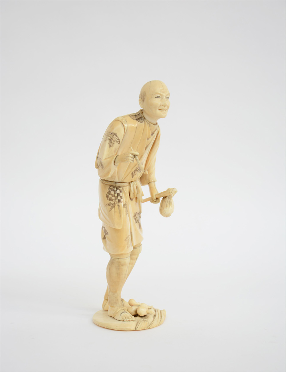 Okimono in avorio raffigurante un contadino con pipa e bisaccia, firma sul fondo in cartiglio rosso (difetti)