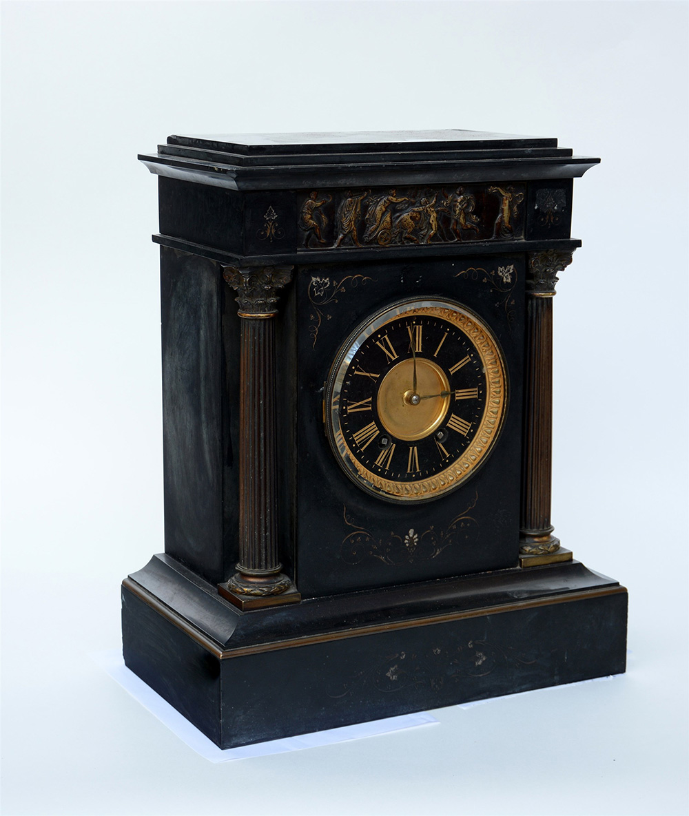 Pendola da tavolo in marmo nero del Belgio con colonnine, movimento con carica settimanale, suoneria delle ore e delle mezze su gong, quadrante in marmo nero con numeri romani (h cm 51) (mancanze)