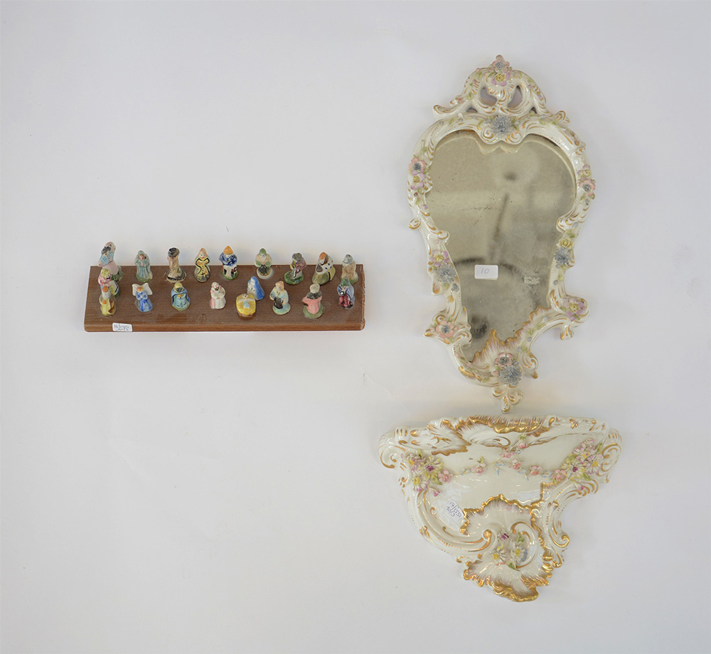 Lotto composto da una mensolina con specchio in porcellana decorata a dorature e fiori e alcune piccole figure da presepe montate su pannello in legno (difetti)
