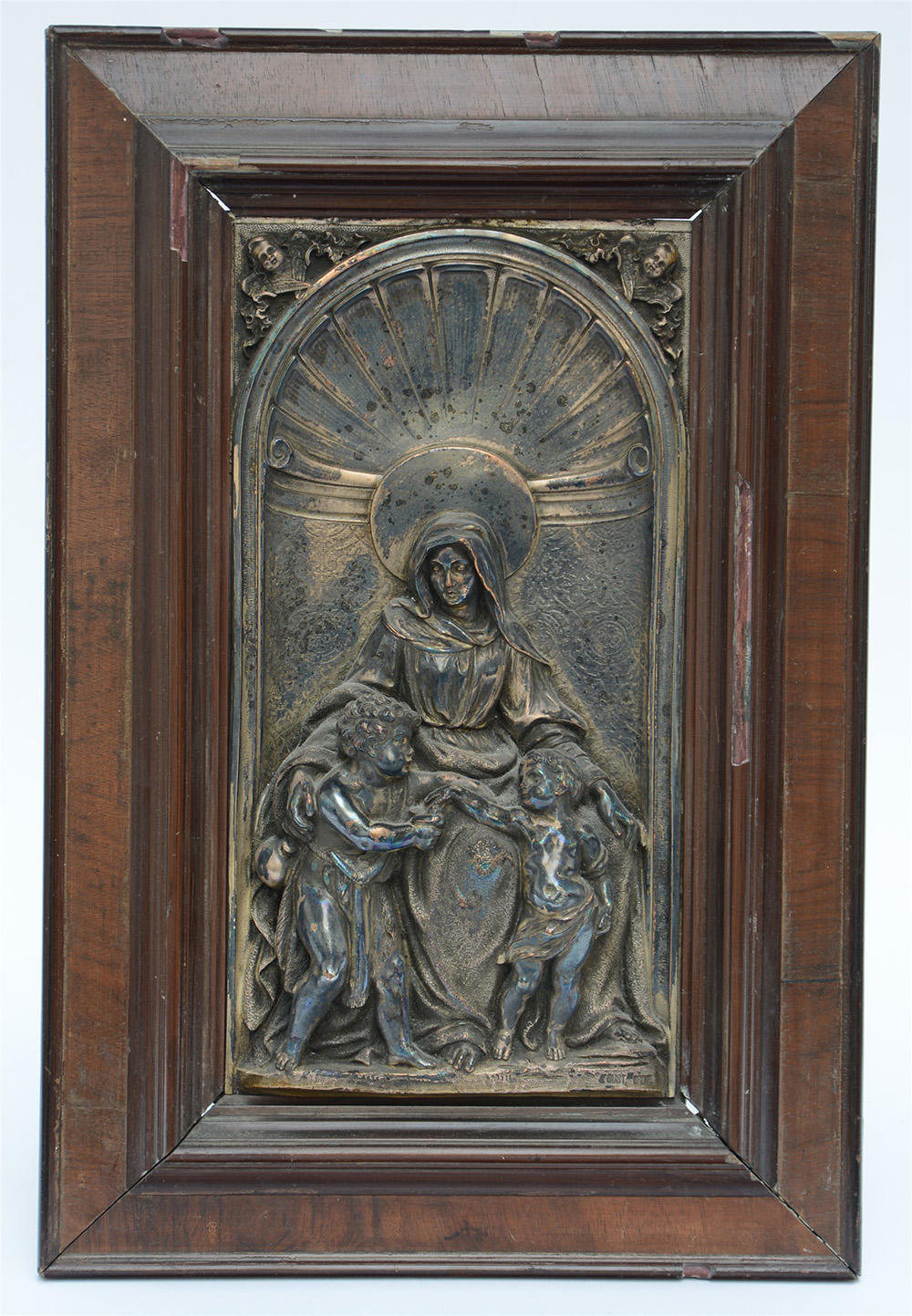 Placca in metallo sbalzato raffigurante Madonna con bambino e San Giovannino (cm 29x16) in cornice (difetti)