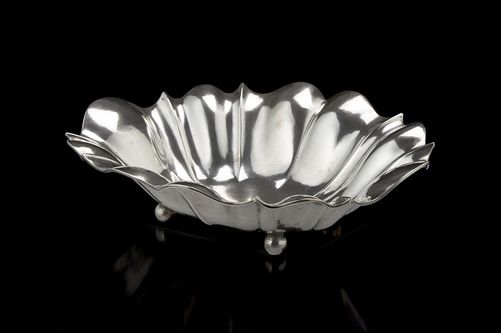 Centrotavola in argento di forma ovale, sagomato da baccellature e costolature radiali alternate e sorretto da quattro piedini sferici. Italia, inizi secolo XX (cm 38x30 ca; h. cm 9,5 ca.) (g 770 ca.) (difetti)