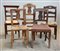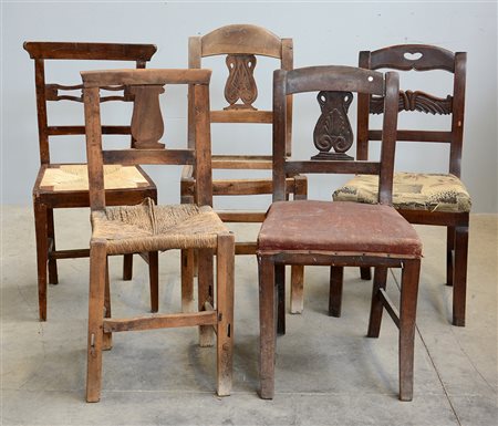Lotto composto da cinque sedie di materiali e forme diverse (difetti e mancanze)