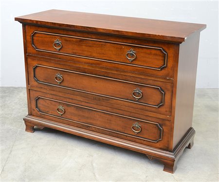 Comò a tre cassetti riquadrati da sagome, pidi leggermente curvi (cm 120x87x44)(difetti)