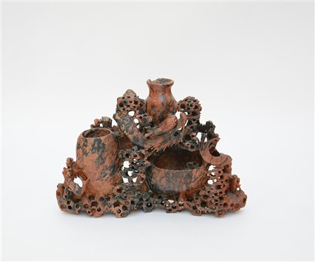 Gruppo scultoreo in pietra saponaria raffigurante uccelli su rami e vasi (difetti e mancanze)