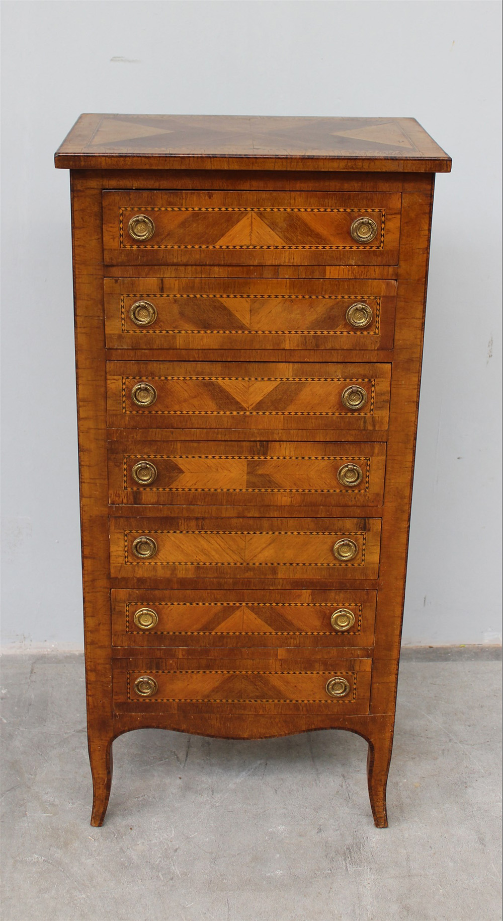 Piccolo settimanale lastronato e filettato a motivi geometrici a sette cassetti sul fronte. Piedini sagomati (cm 50x148x32)