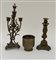 Lotto composto da due candelieri decoratri in rilievo ed un mortaio in ottone e metallo patinato, misure diverse (difetti)