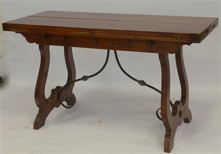 Tavolo fratino con piano apribile. Gambe a lira unite da traverse in metallo. Sec. XX (cm 140x80x60)(difetti)