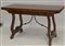 Tavolo fratino con piano apribile. Gambe a lira unite da traverse in metallo....