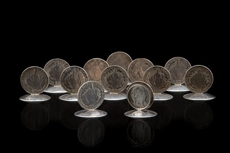 Dodici segnaposto in argento (935/1000) Austria 1925-54 (h. cm 3) (gr tot. 135 ca.) monete austroungariche del secolo XIX (20 Kreuzer) Austria 1925-54 (h. cm 3) (g tot 135 ca.)