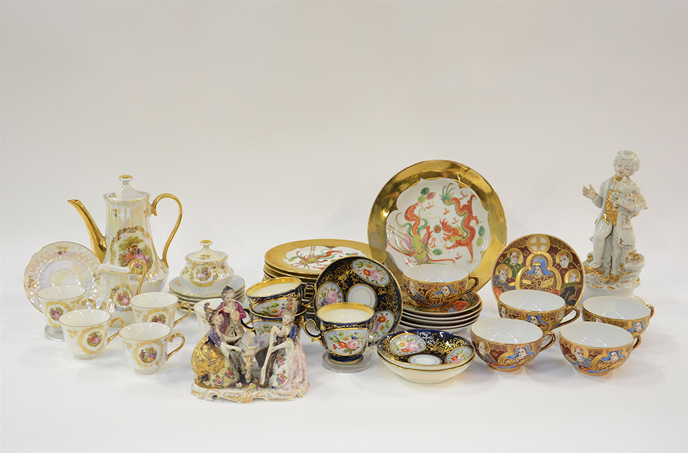 Lotto composto da un gruppo in porcellana policromia raffigurante concertino, una scultura in porcellana bianca e oro raffigurante ragazzo con cagnolino, e alcune tazze e piattini di manifatture e decori diversi (difetti)