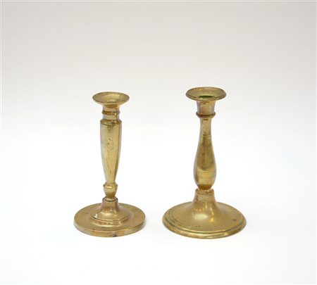 Due candelieri diversi in ottone. Secolo XIX (difetti)