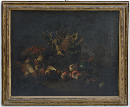 Scuola toscana del secolo XVII "Natura morta con frutta e funghi" olio su tela (cm 77x97). In cornice antica (difetti, restauri e mancanze)