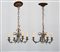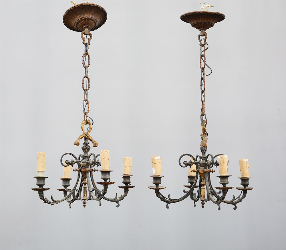 Coppia di piccoli lampadari in ferro battuto a quattro luci con bracci...