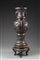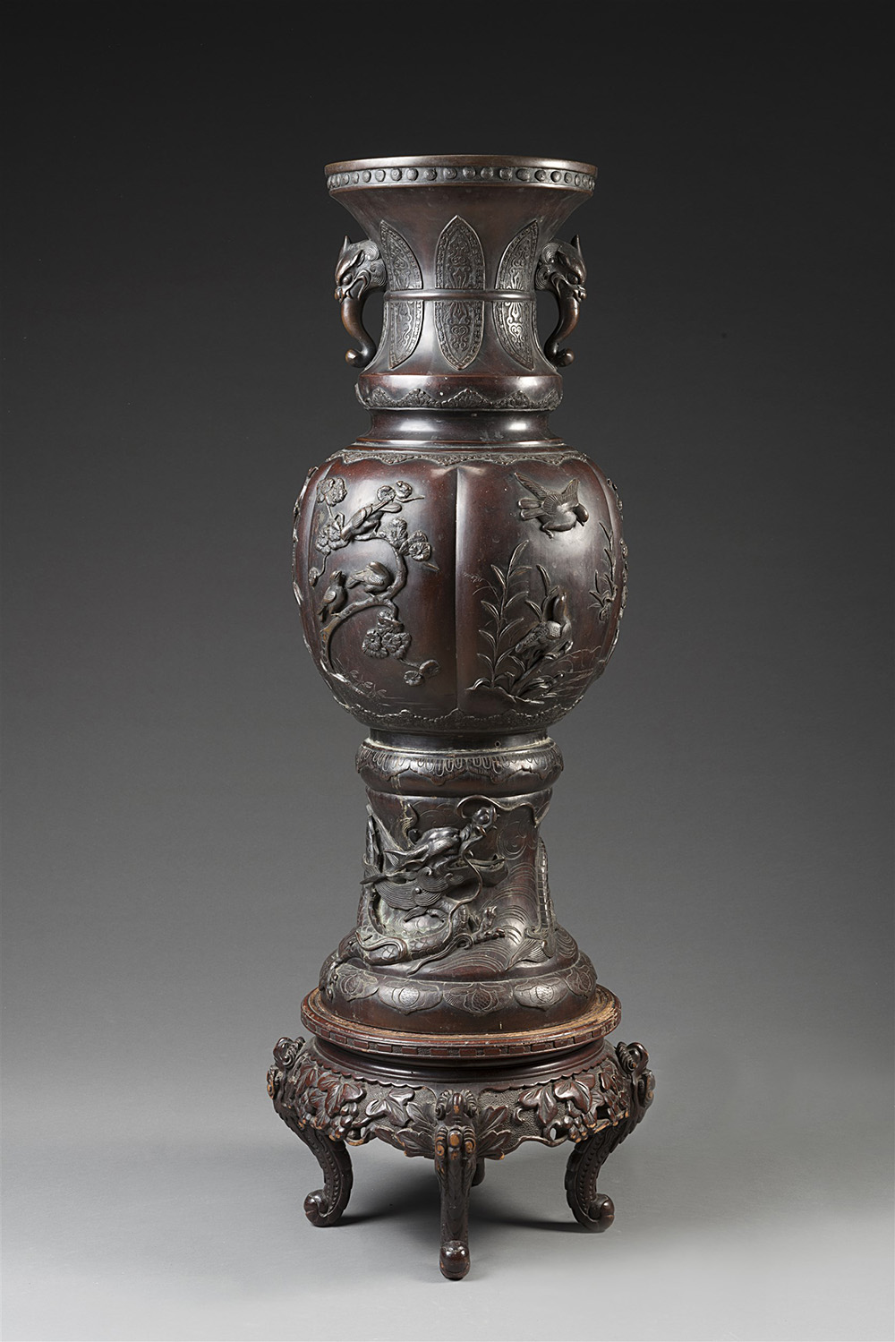 Vaso in bronzo brunito decorato in rilievo a fregi, rami con volatili e draghi, manici a forma di teste antropomorfe, base in legno (lievi difetti)