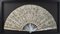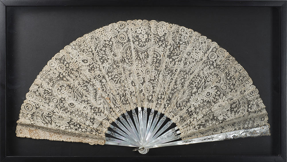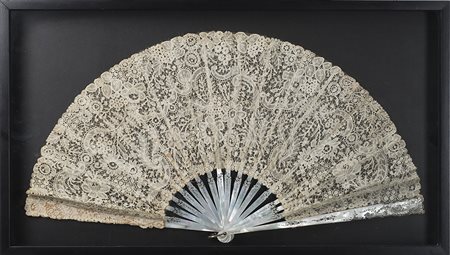Ventaglio con pagina in pizzo al tombolo. Decoro floreale e volute, stecche traforate e decorate con fregi argentati. Montato in teca ebanizzata (cm 67x35) (difetti)