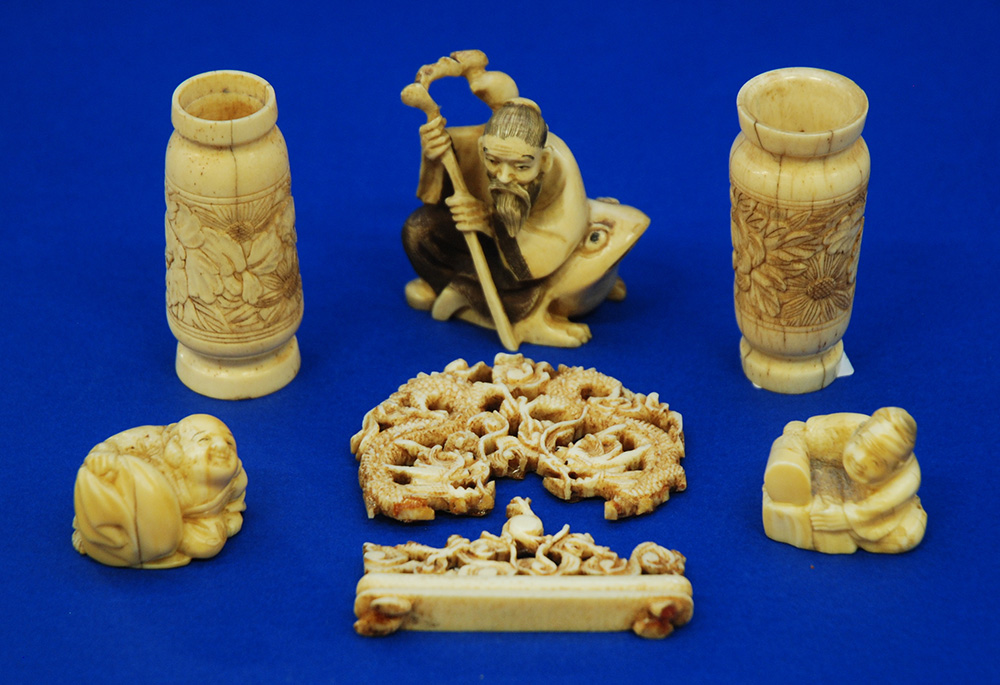 Lotto di sei oggetti in osso e avorio (difetti e mancanze)
