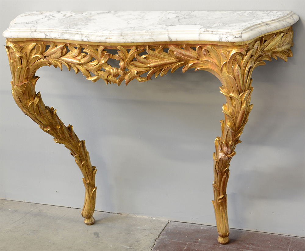 Console pensile in legno intagliato e dorato a motivi vegetali e nastro, piano in marmo venato (cm 111x87x38)(difetti)